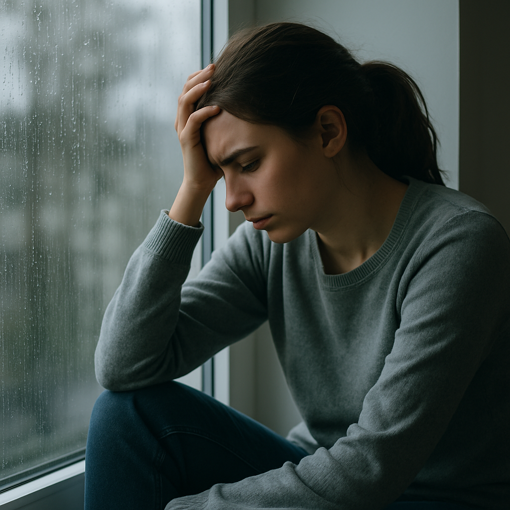 A young woman sitting quietly by a window with soft sunlight behind her, appearing reflective and grieving — a gentle, symbolic image representing healing after loss.